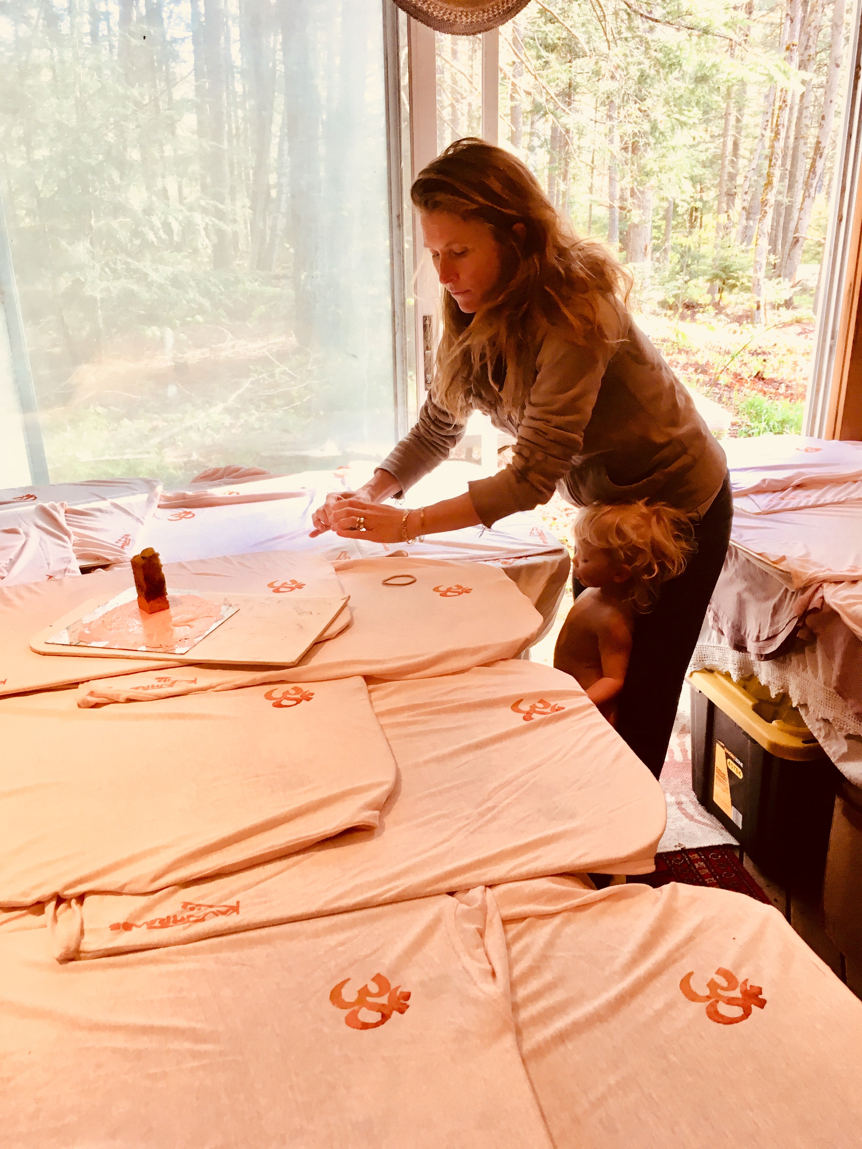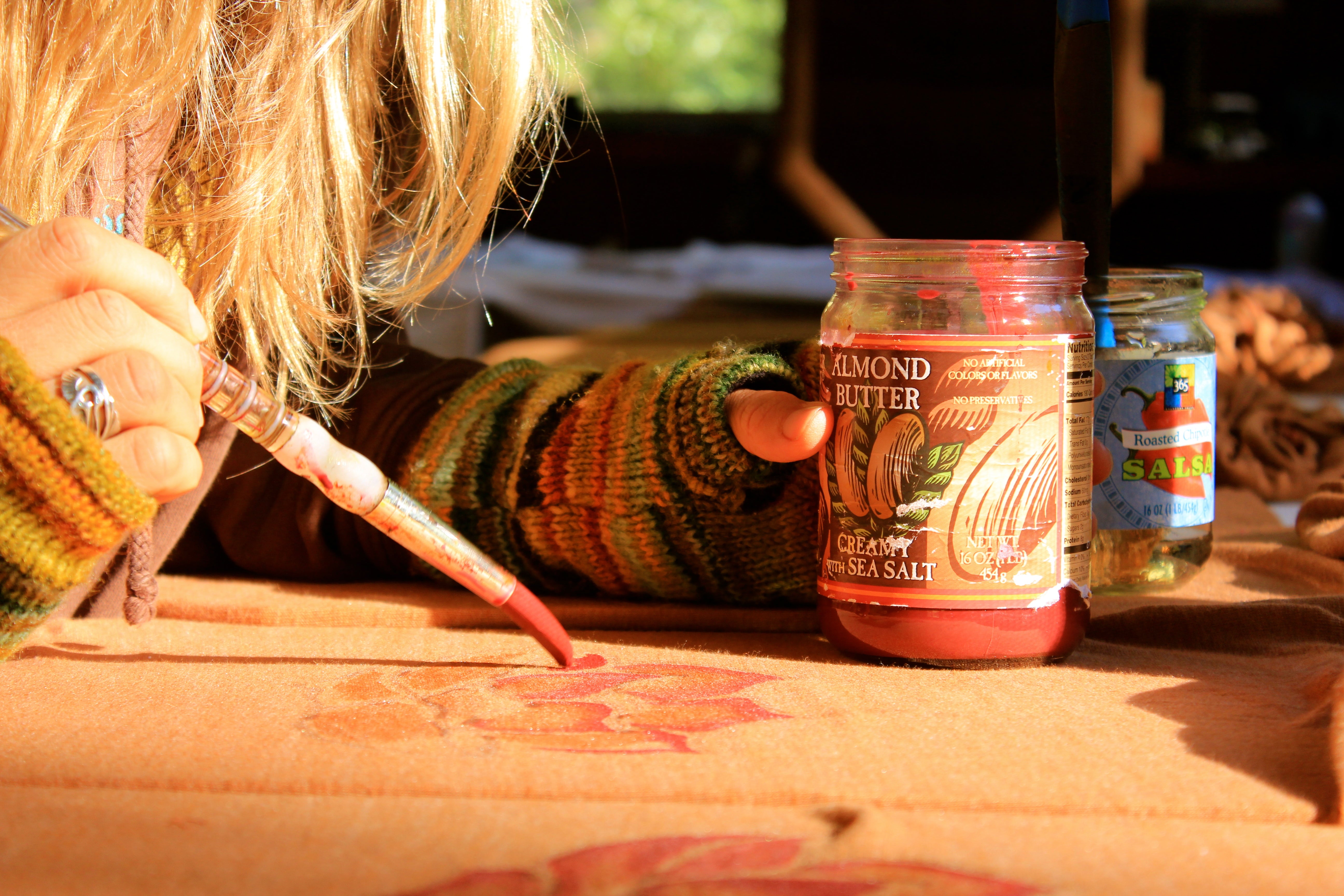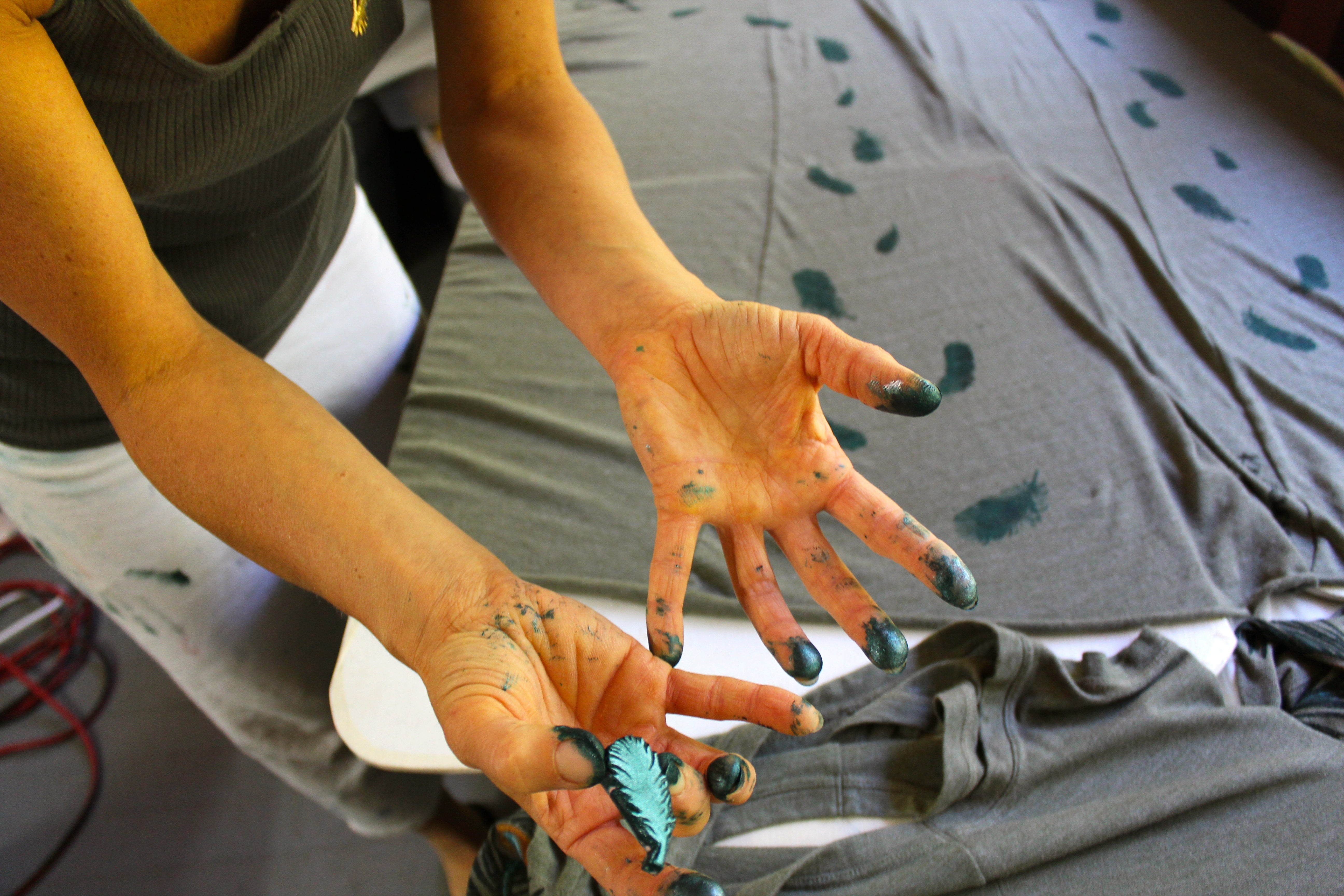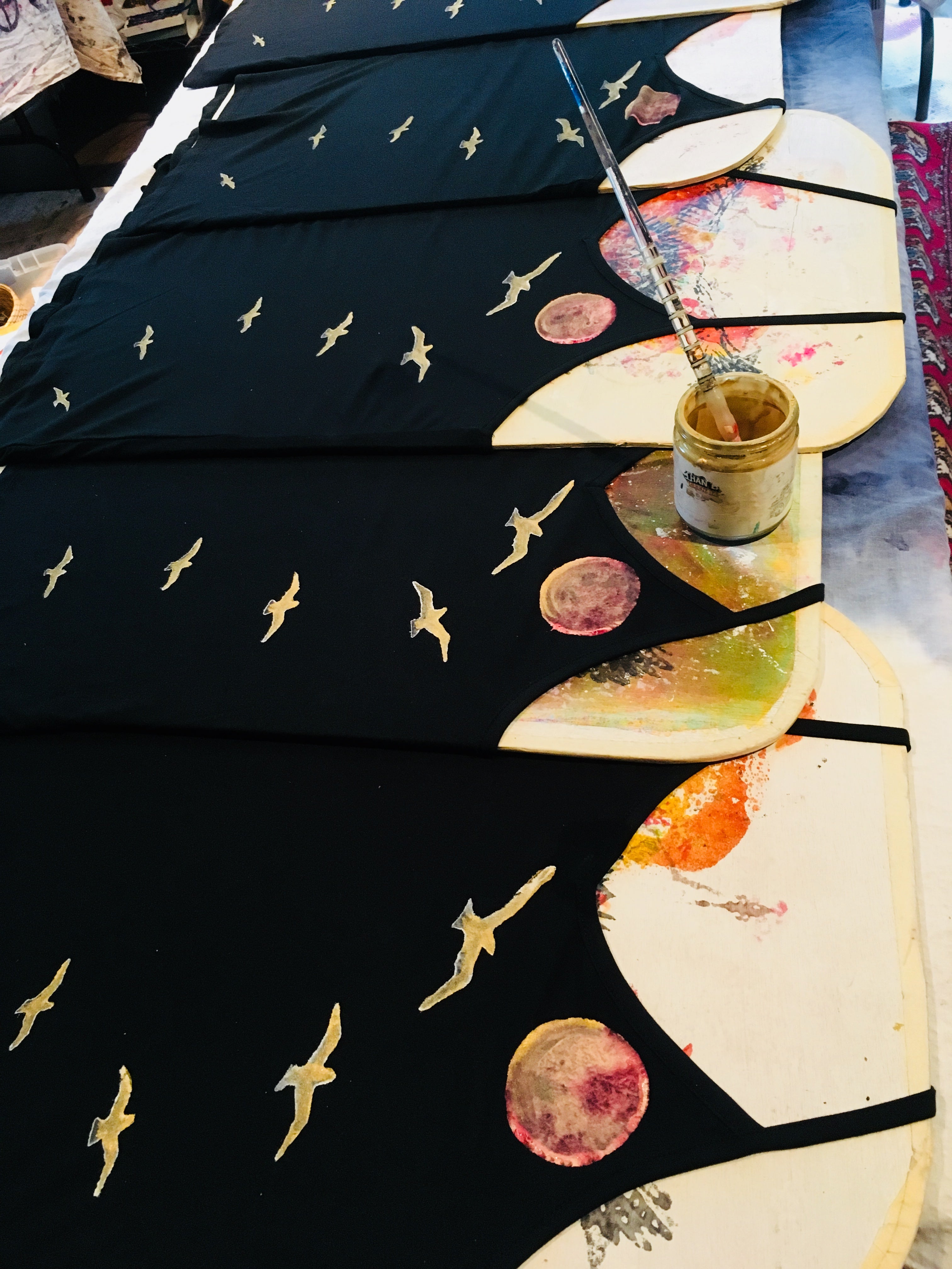 Design born, and reborn... sketched and re-sketched... cloth washed and dried... outline drawn freehand on cloth...dried in sun...hand painted with a brush and my recycled almond butter jars of paint...dried in the sun...if called for, repeated on the back...dried in the sun...block printed with our own hand carved, hand painted prints...dried in the sun...heat pressed to fix the paints so it can be machine washable...if needed washed and dried once again...then off to market to clothe human beings in art.