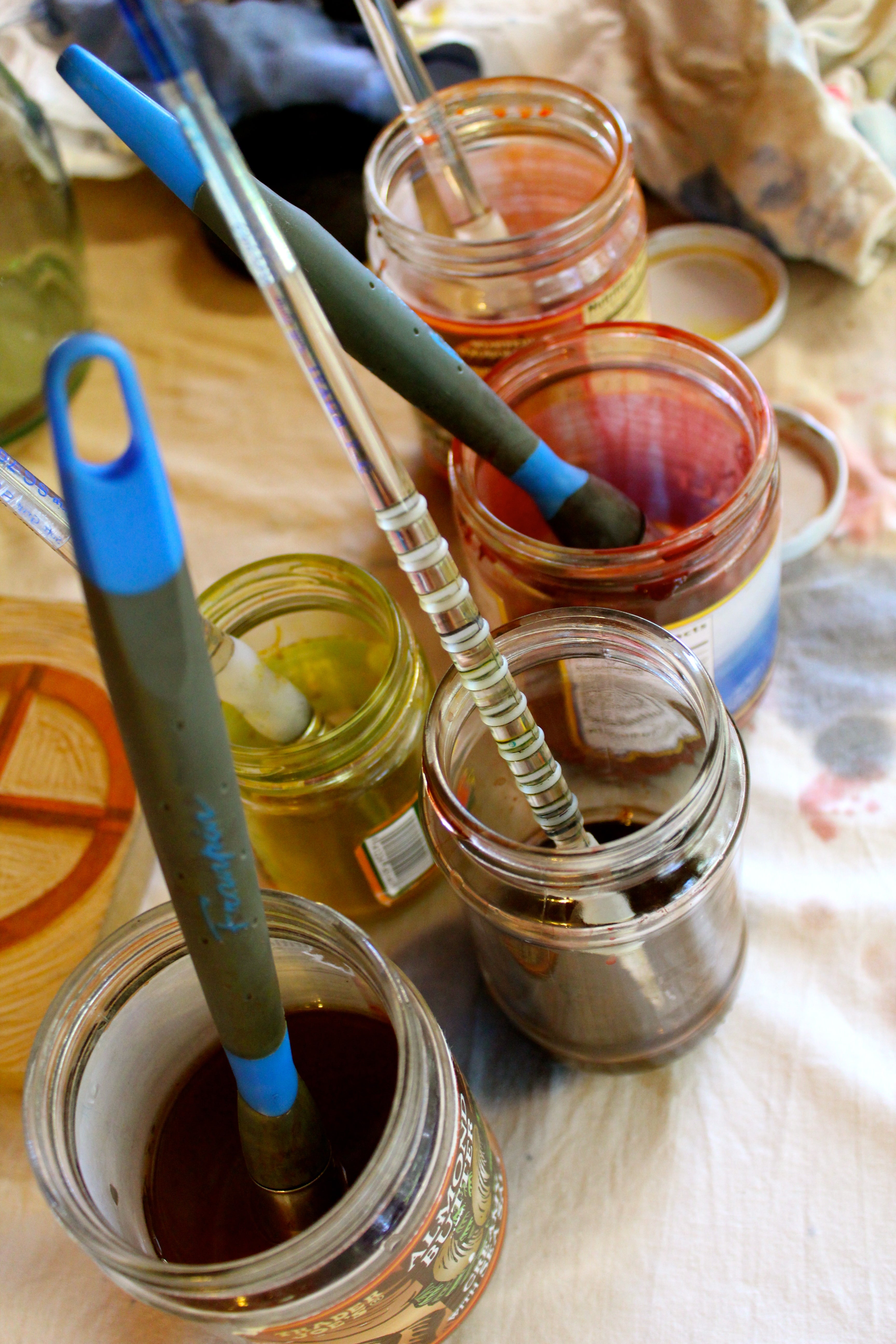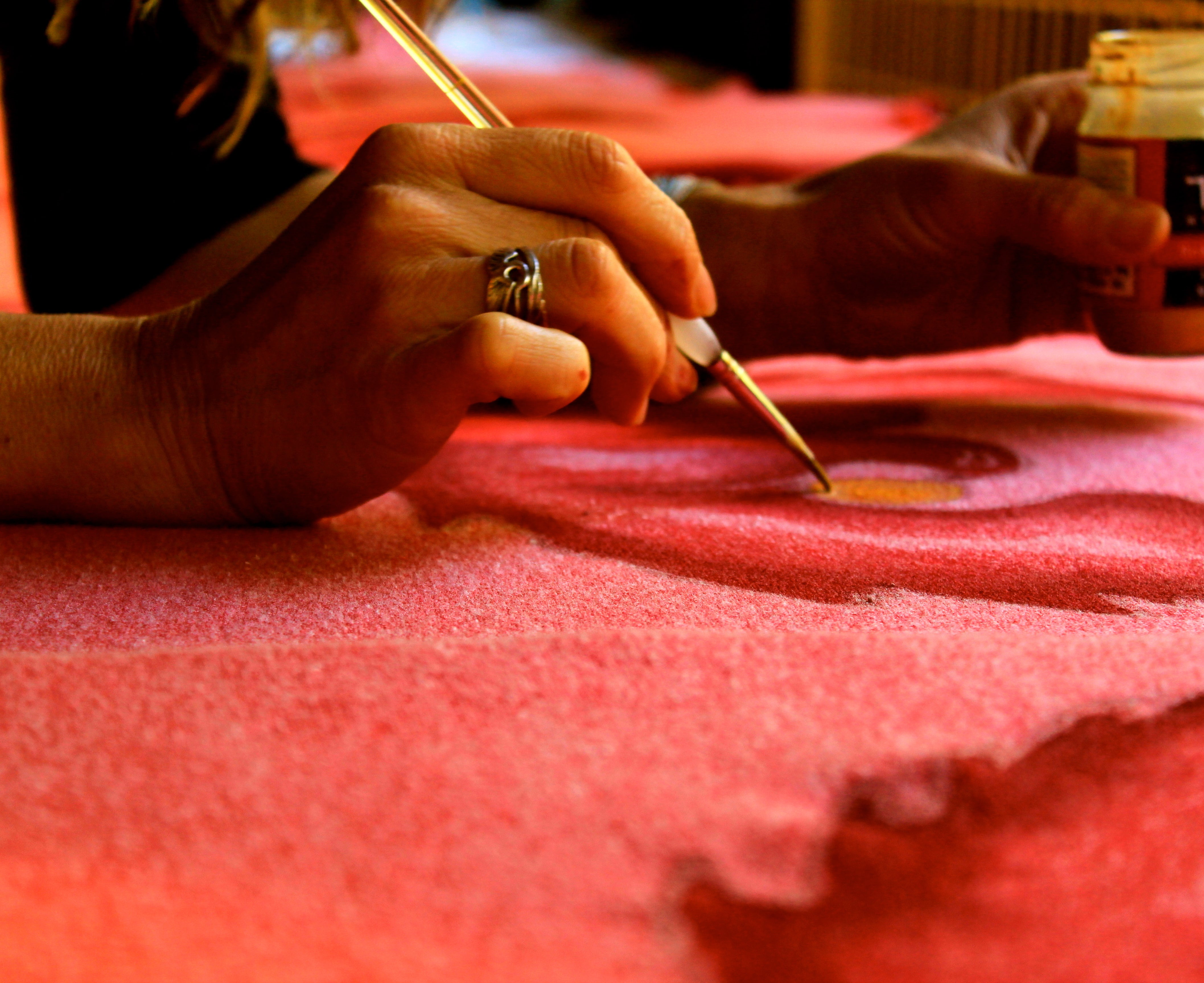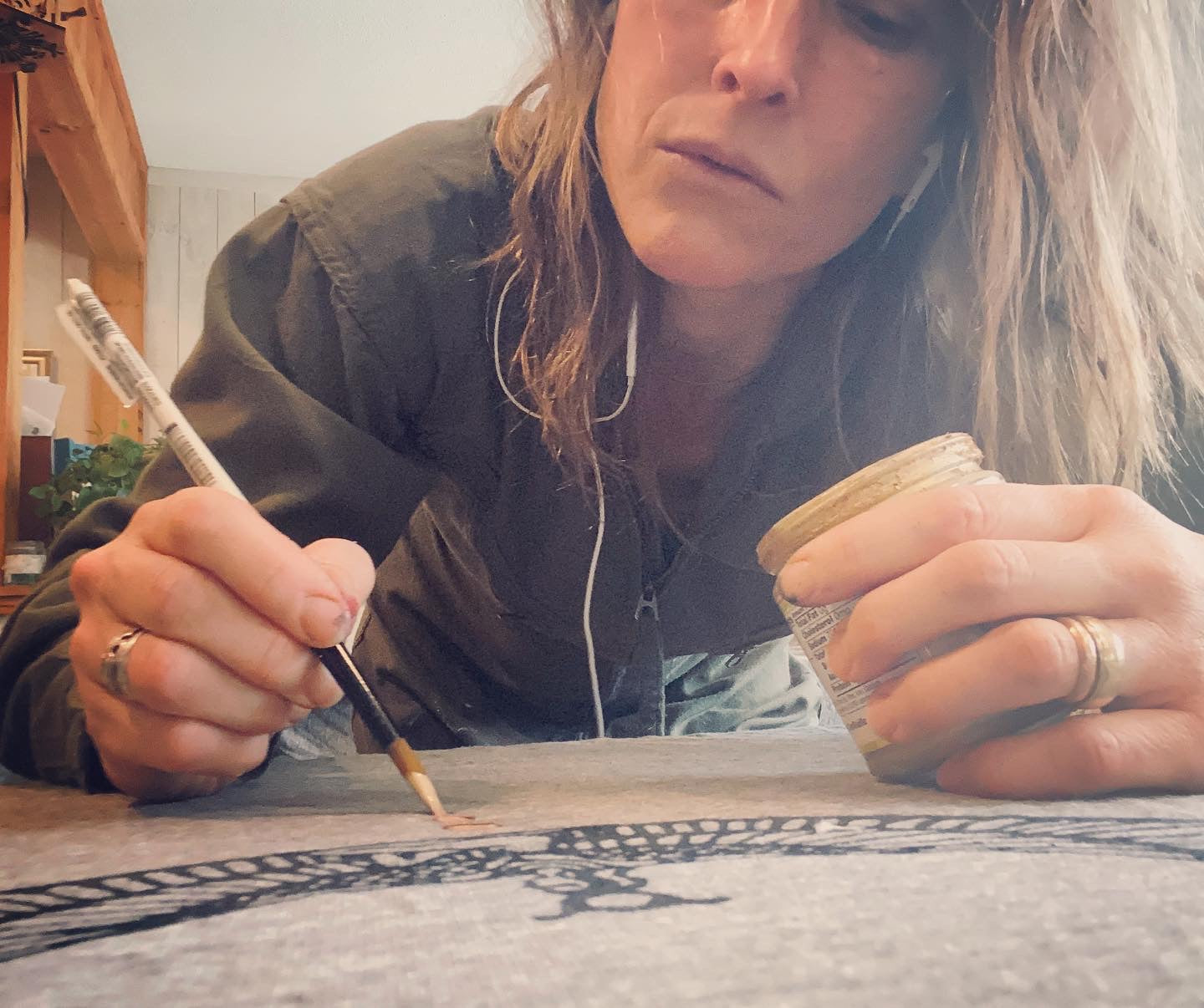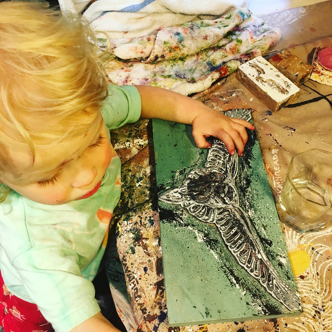 Design born, and reborn... sketched and re-sketched... cloth washed and dried... outline drawn freehand on cloth...dried in sun...hand painted with a brush and my recycled almond butter jars of paint...dried in the sun...if called for, repeated on the back...dried in the sun...block printed with our own hand carved, hand painted prints...dried in the sun...heat pressed to fix the paints so it can be machine washable...if needed washed and dried once again...then off to market to clothe human beings in art.